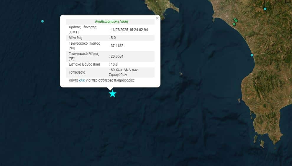 Το επίκεντρο του σεισμού εντοπίζεται 60 χλμ Δυτικά, νοτιοδυτικά των Στροφάδων, ανοιχτά της Ζακύνθου.
