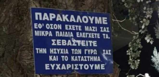 Χωρίς να ισχυρίζεται πως πολλοί γονείς μικρών παιδιών αποφεύγουν να τα περιορίσουν στις οικογενειακές κοινωνικές εξόδους τους, έτσι ώστε να μην ενοχλούν τους γύρω, μια Ελληνίδα μαμά, η οποία τα τελευταία χρόνια ζει μόνιμα στο Λονδίνο, παρατήρησε σε μία ελληνική ταβέρνα κάτι που την ενόχλησε πολύ.Η Φ. Μ., λοιπόν, φίλη του Infokids.gr, βρέθηκε τον περασμένο μήνα για διακοπές στην Ελλάδα με τον σύζυγο και τα δύο μικρά παιδιά της, και κατά την επίσκεψή της σε οικογενειακή επιχείρηση εστίασης “έπεσε πάνω” σε αυτή την ταμπέλα που την έκανε να θυμώσει και να γράψει το παρακάτω, με το οποίο πιστεύουμε, ότι πολλοί θα συμφωνήσετε: