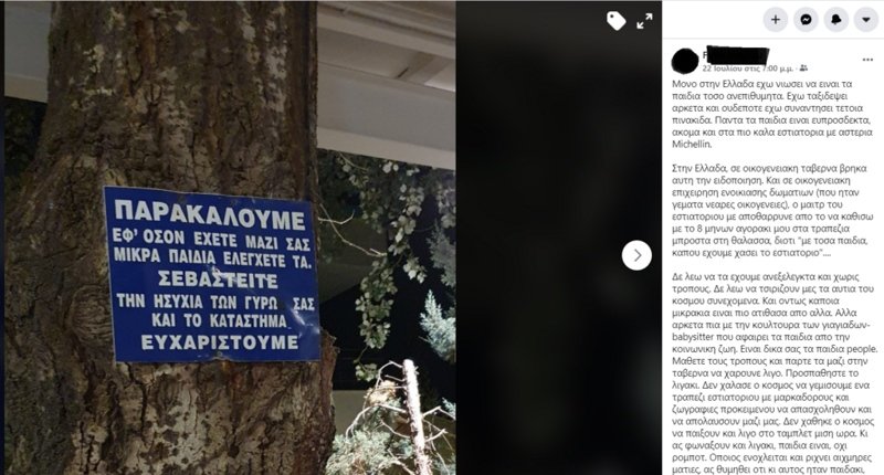 “Μόνο στην Ελλάδα έχω νιώσει να είναι τα παιδιά τόσο ανεπιθύμητα. Έχω ταξιδέψει αρκετά και ουδέποτε έχω συναντήσει τέτοια πινακίδα. Πάντα τα παιδιά είναι ευπρόσδεκτα, ακόμα και στα πιο καλά εστιατόρια με αστέρια Michellin.