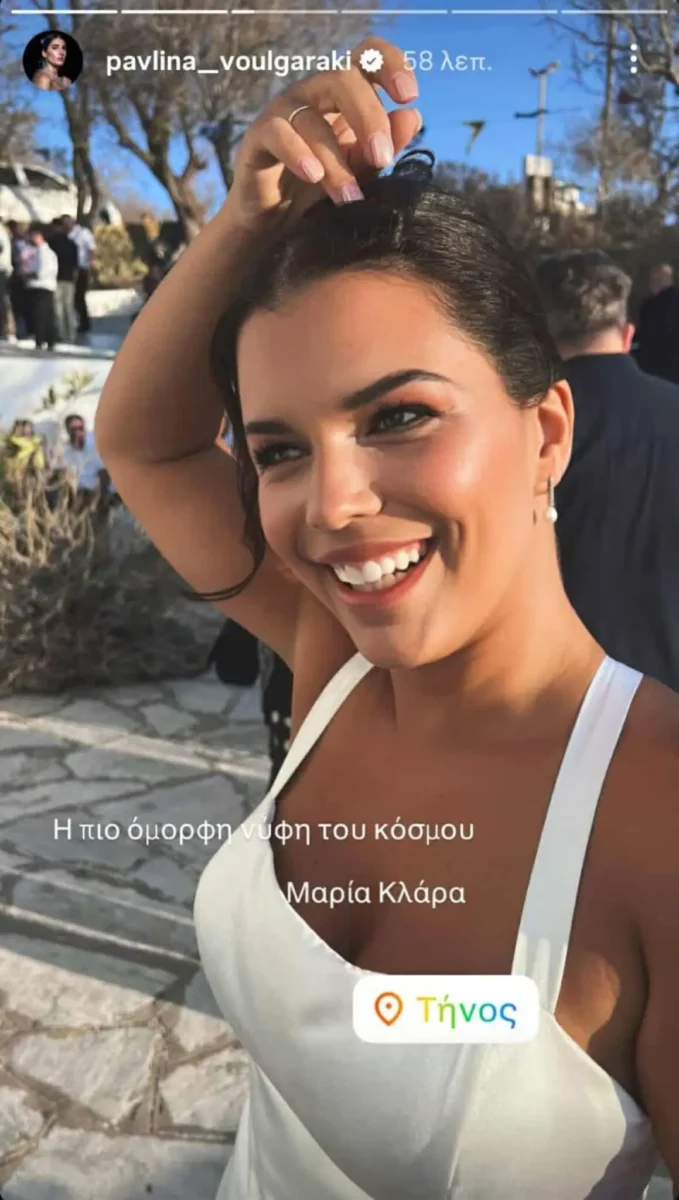 Η Παυλίνα Βουλγαράκη ταξίδεψε στην Τήνο για την τελετή και απαθανάτισε τη Μαρία Κλάρα Μαχαιρίτσα ενώ πήγαινε στην εκκλησία για τον γάμο της, έτοιμη να παντρευτεί με τον αγαπημένο της. «Η πιο όμορφη νύφη του κόσμου», έγραψε και πράγματι η εντυπωσιακή εικόνα της νύφης αντικατοπτρίζει τη μοναδική ατμόσφαιρα της ημέρας, με την προσωπική χαρά και τη συγκίνηση να κυριαρχούν στο χώρο.