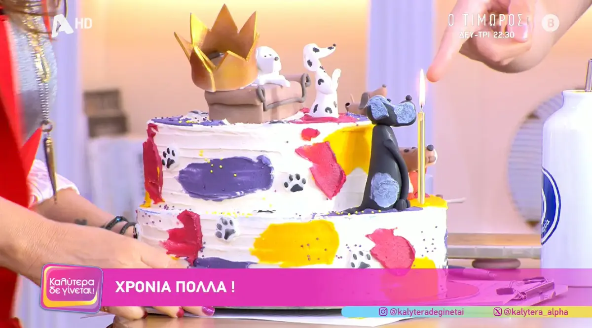 Δεν γνώριζε, όμως, τι τούρτα της είχαν ετοιμάσει και μόλις την αντίκρισε συγκινήθηκε και ενθουσιάστηκε. Είχαν δημιουργήσει μία διώροφη τούρτα που πάνω είχε τα αγαπημένα της σκυλάκια, που έχουν ιδιαίτερη σημασία για εκείνη. Στη συνέχεια, μάλιστα, έπαιξαν και ένα βίντεο ευχές που της έστειλαν διάφορα πρόσωπα της εγχώριας showbiz και από τον χώρο της τηλεόρασης αλλά και του τραγουδιού, φίλους και συνεργάτες της, όπως είναι η Σίσσυ Χρηστίδου, η Πέγκυ Ζήνα, ο Χρήστος Φερεντίνος, ο Θανάσης Πάτρας, αλλά και η Ελένη Φουρέιρα.