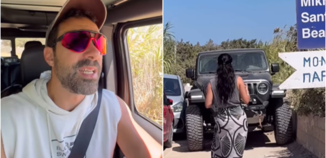 Ρόλο παρκαδόρου ανέλαβε η Χριστίνα Μπόμπα κατά τη διάρκεια των διακοπών της στην Πάρο με τον Σάκη Τανιμανίδη, καθώς βοήθησε τον σύζυγό της να περάσει με ένα μαύρο τζιπ από ένα ιδιαίτερα στενό σημείο του νησιού.