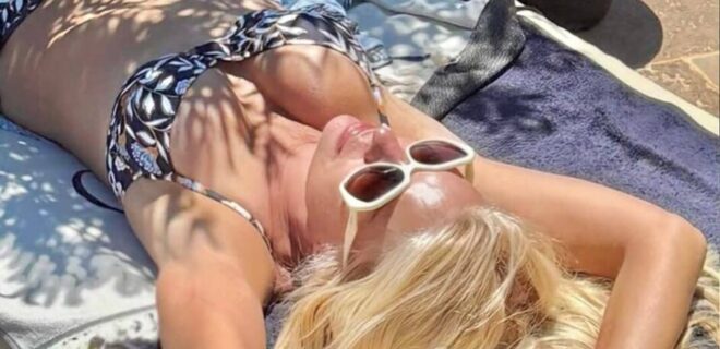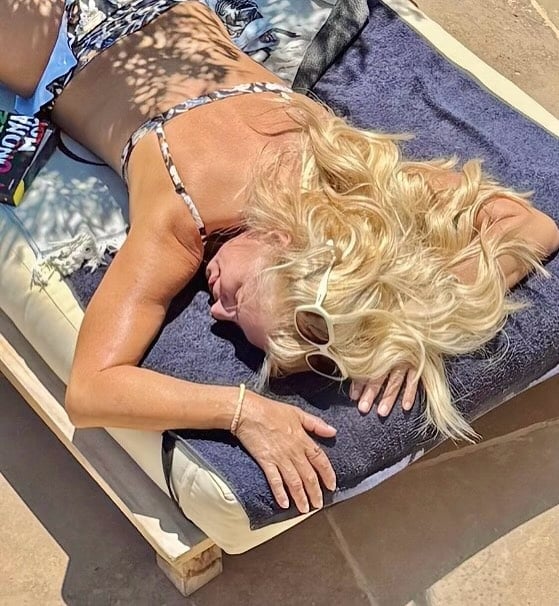 Όπως βλέπουμε, η Ελένη Μενεγάκη χαλαρώνει στην ξαπλώστρα, έχοντας συντροφιά το βιβλίο της.
