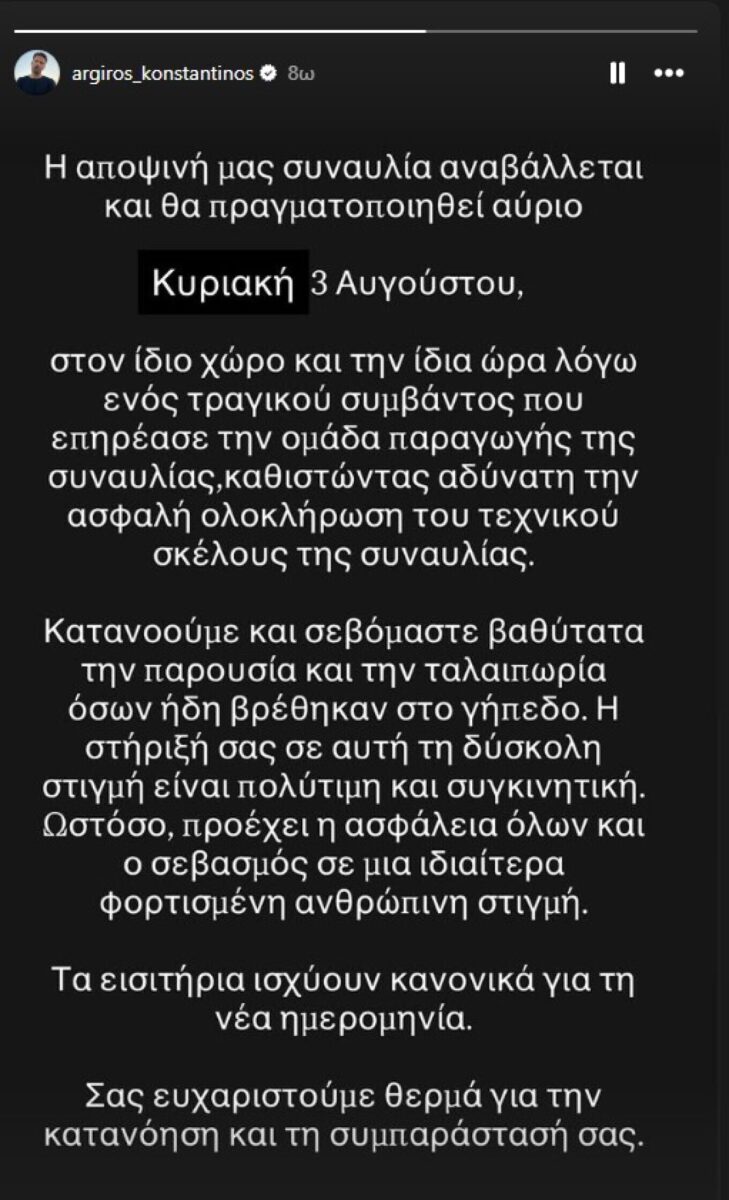 Ωστόσο, προέχει η ασφάλεια όλων και ο σεβασμός σε μία ιδιαίτερα φορτισμένη ανθρώπινη στιγμή. Τα εισιτήρια ισχύουν κανονικά για την νέα ημερομηνία. Σας ευχαριστούμε θερμά για την κατανόηση και την συμπαράσταση σας».