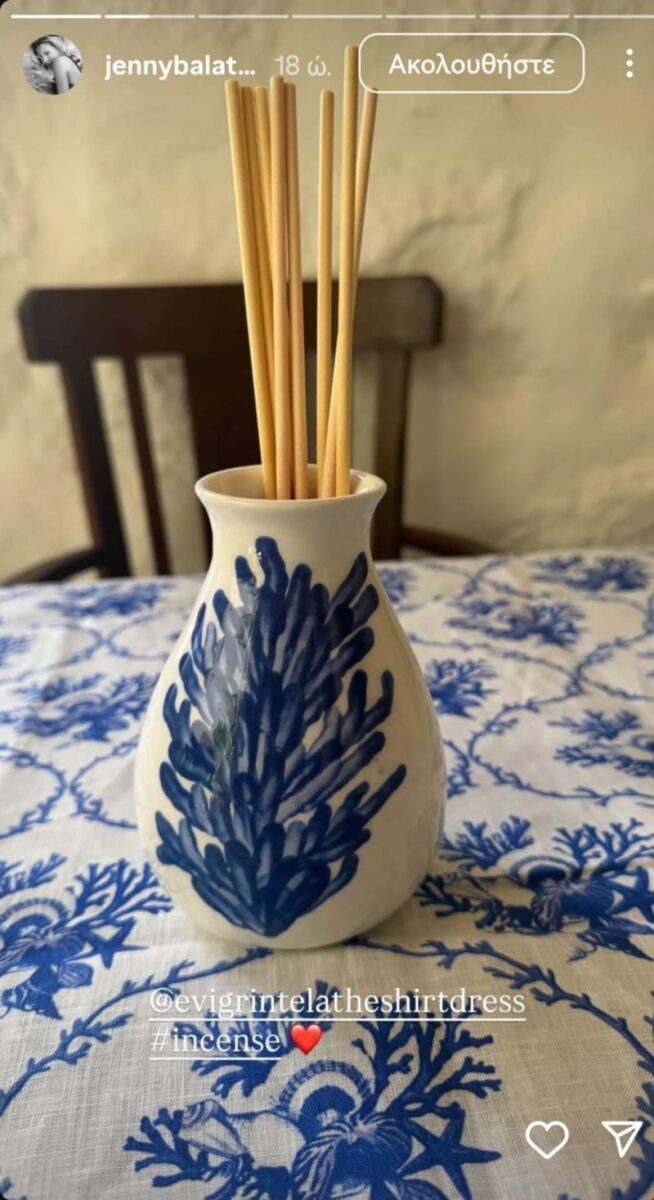 Το μεσημέρι της Τρίτης 29 Ιουλίου, η Τζένη Μπαλατσινού επέλεξε να μας προσφέρει μία ματιά στην τραπεζαρία του σπιτιού της, μέσα από μία ανάρτηση στον προσωπικό της λογαριασμό στο instagram. Μπροστά από ένα παράθυρο με γαλάζια παντζούρια και στην επιφάνεια ενός δαπέδου που έχει το χαρακτηριστικό στιλ που συναντάμε σε σπίτια στα Δωδεκάνησα, η τραπεζαρία της αποτελείται από παραδοσιακές ξύλινες καρέκλες, ενώ το τραπεζομάντιλο και τα περίτεχνα βάζα με λουλούδια ή αρωματικά sticks εσωτερικού χώρου είναι συνώνυμο της νησιώτικης αισθητικής, με το λευκό και το μπλε να πρωταγωνιστούν σε ένα ενδιαφέρον παιχνίδισμα.