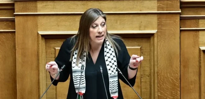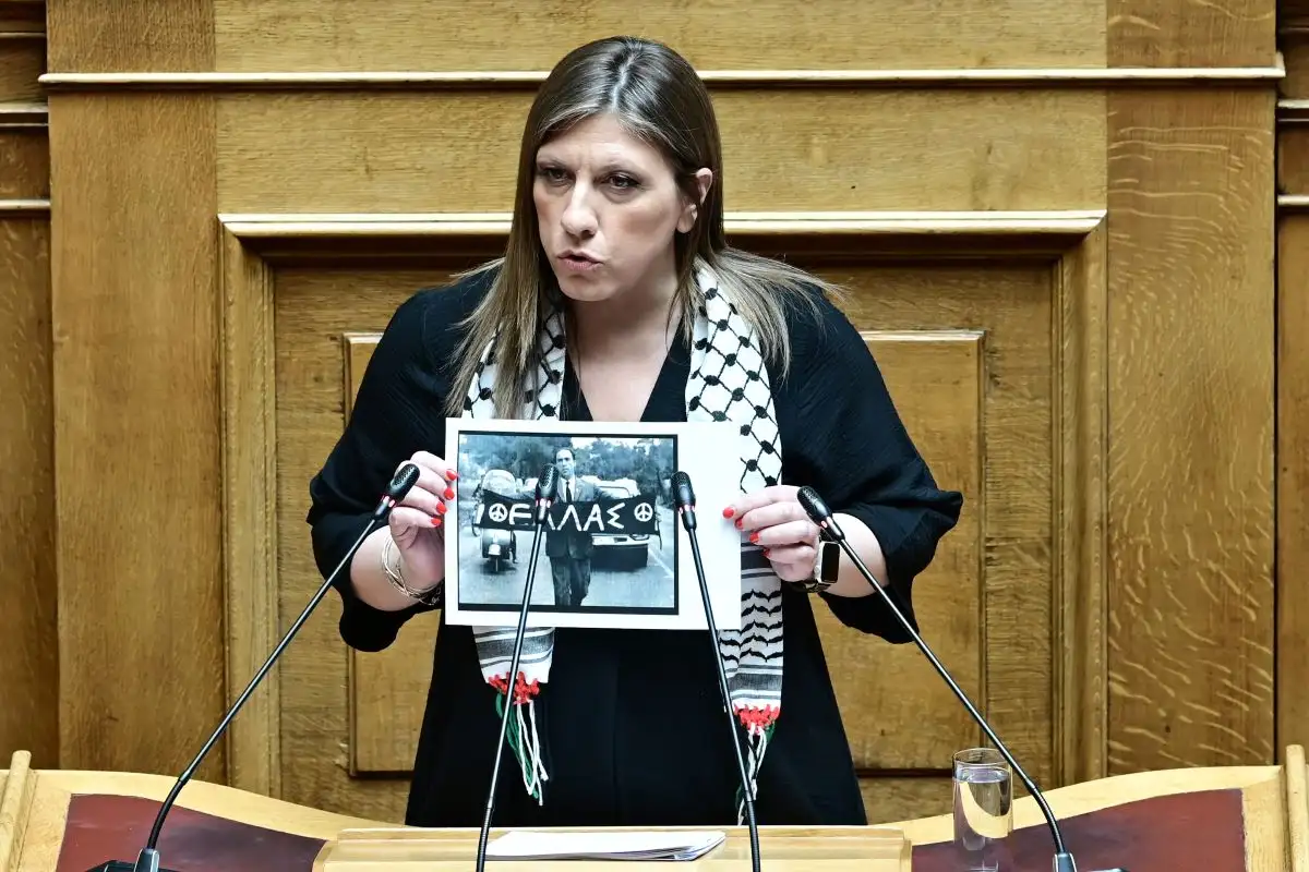 Με μαντήλα της Παλαιστίνης στον λαιμό, εμφανίστηκε η πρόεδρος της Πλεύσης Ελευθερίας, Ζωή Κωνσταντοπούλου, στην Ολομέλεια της Βουλής κατά την επετειακή αναφορά στη μνήμη του Γρηγόρη Λαμπράκη σήμερα Δευτέρα (26.5.25).