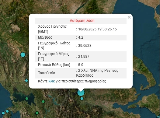 Σεισμός σημειώθηκε το βράδυ της Δευτέρας (18/08), νότια της Καρδίτσας.