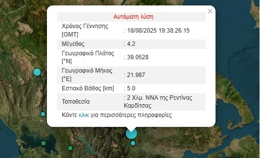Σεισμός σημειώθηκε το βράδυ της Δευτέρας (18/08), νότια της Καρδίτσας.