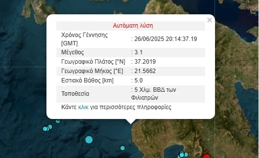 Σεισμός μεγέθους 3,1 της κλίμακας Ρίχτερ σημειώθηκε απόψε (26/06, 23:14) στα Φιλιατρά.