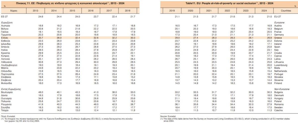 Σύμφωνα με τα στοιχεία της Eurostat για το 2024, το ποσοστό των Ελλήνων πολιτών σε κίνδυνο φτώχειας και κοινωνικού αποκλεισμού ήταν 26,9%, όταν ο μέσος όρος της Ευρώπης των 27 ήταν 21%. Χειρότερα ποσοστά κατέγραψαν μόνο η Ρουμανία (27,9%) και η Βουλγαρία (30,3%). Η δεύτερη εντάσσεται στη ζώνη του ευρώ την 1η Ιανουαρίου του 2026.