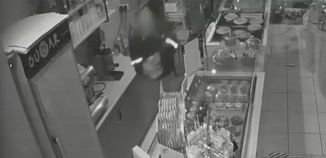 Συγκεκριμένα, το περιστατικό συνέβη πριν από μερικές ημέρες περίπου στις 3:00 τα ξημερώματα και ο διαρρήκτης έσπασε την τζαμαρία του ζαχαροπλαστείου με ένα καπάκι από φρεάτιο.