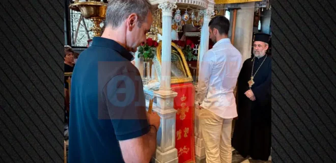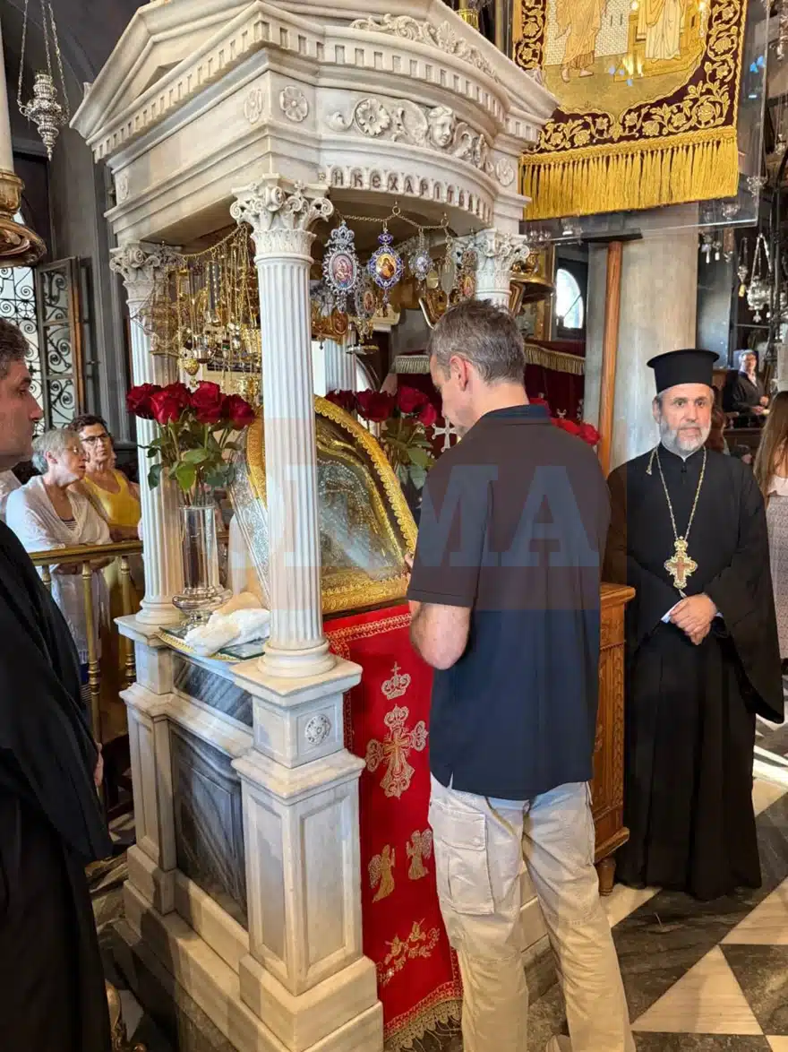 Λίγα λεπτά αργότερα, οι δεκάδες πιστοί που βρίσκονταν στην Παναγία είδαν ανάμεσά τους τον «Νόλε» και τον κ. Μητσοτάκη να περιμένουν να ανάψουν κερί και να προσκυνήσουν τη θαυματουργή εικόνα.