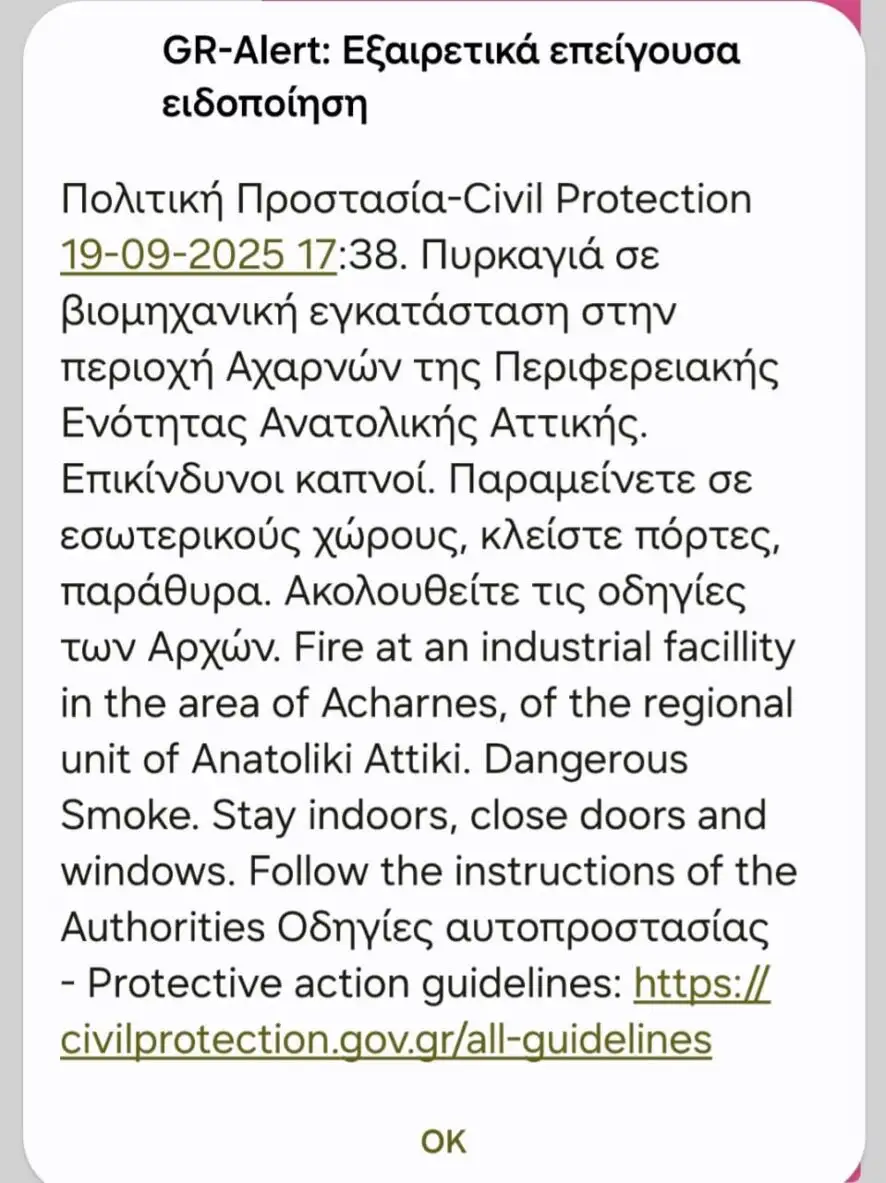 Λίγο μετά την εκδήλωση της πυρκαγιάς, εστάλη μήνυμα 112 στους κατοίκους κοντινών περιοχών να παραμείνουν σε εσωτερικούς κλειστούς χώρους, με κλειστές πόρτες και παράθυρα λόγω των επικίνδυνων καπνών.