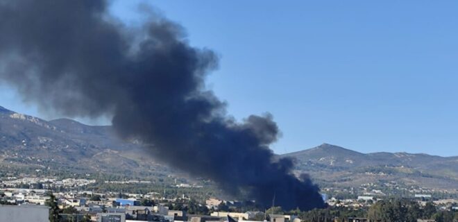 Η πυρκαγιά ξέσπασε σε προαύλιο χώρο εργοστασίου με παλέτες στην οδό Τατοΐου, ενώ οι έντονοι μαύροι καπνοί φαίνονται από πολύ μακριά.