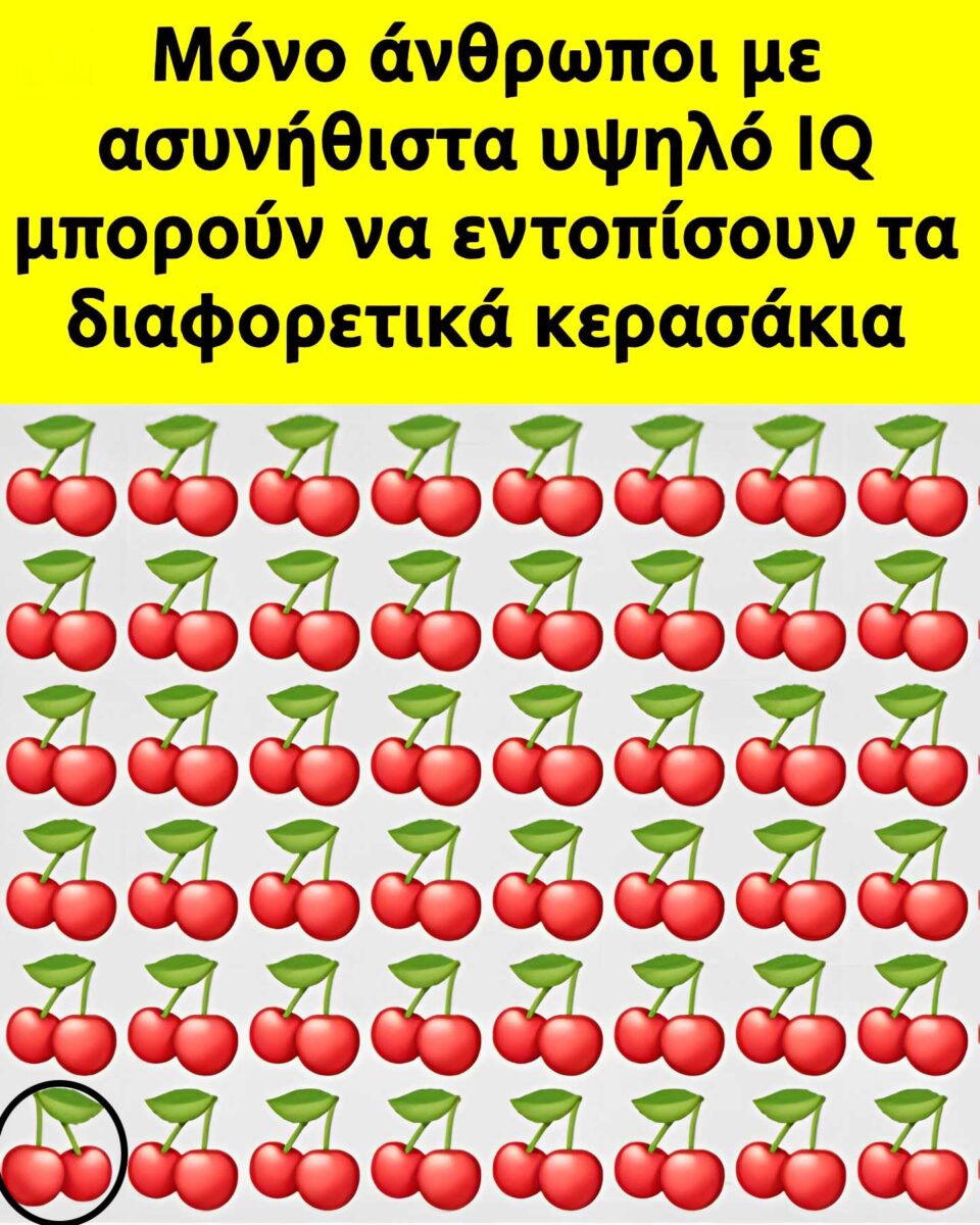 Η εικόνα είναι ένα οπτικό τεστ παρατηρητικότητας που προτρέπει τον θεατή να εντοπίσει το “διαφορετικό” αντικείμενο ανάμεσα σε πολλές όμοιες εικόνες από κεράσια.