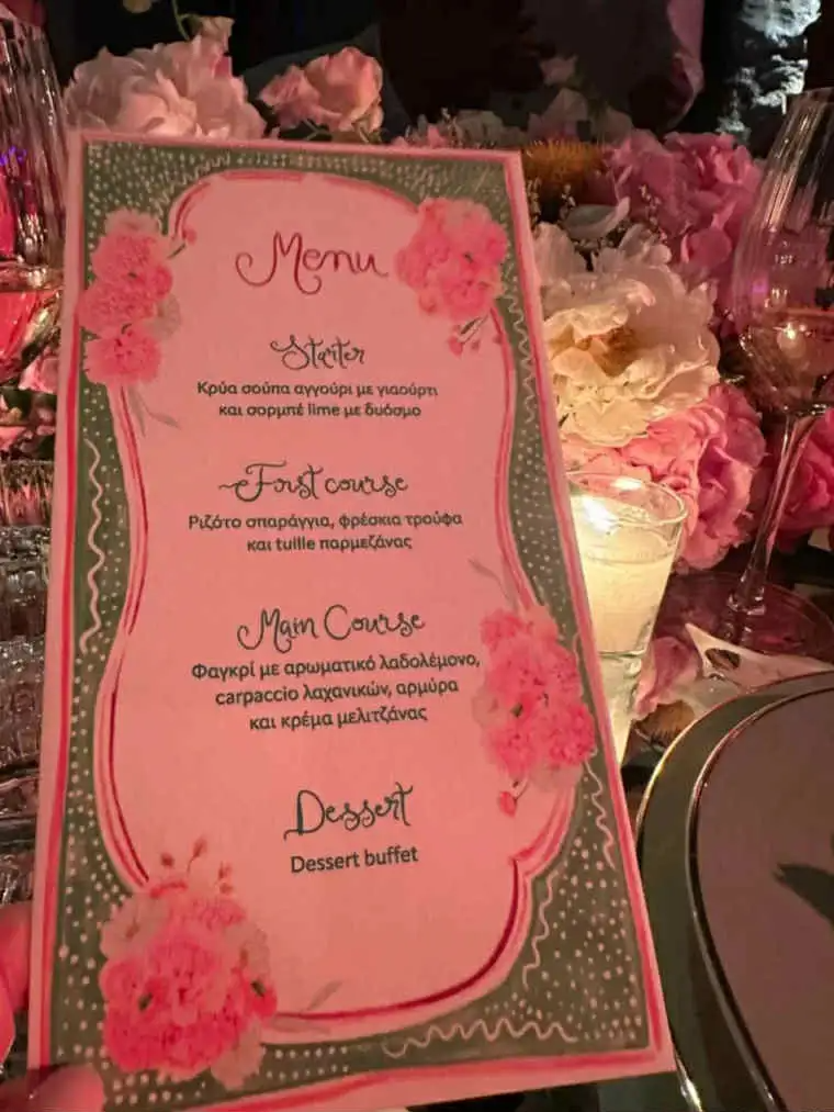 Από αναρτήσεις που έγιναν στα social media, είδαμε και το μενού που είχε επιλέξει το ζευγάρι για τον τραπέζι στον γάμο του, το οποίο ήταν λιτό αλλά με ιδιαίτερα γεύσεις.