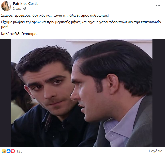 «Σεμνός, τρυφερός, δοτικός και πάνω απ’ όλα έντιμος άνθρωπος. Είχαμε μιλήσει τηλεφωνικά πριν μερικούς μήνες και είχαμε χαρεί τόσο πολύ για την επικοινωνία μας! Καλό ταξίδι Γεράσιμε…», έγραψε στη λεζάντα της ανάρτησής του ο Πατρίκιος Κωστής.