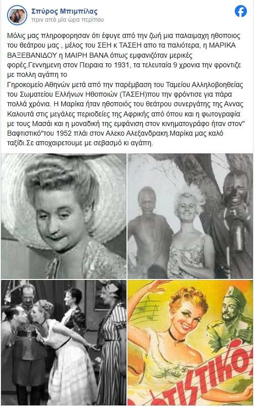 «Μόλις μας πληροφόρησαν ότι έφυγε από την ζωή μια παλαίμαχη ηθοποιός του θεάτρου μας, μέλος του ΣΕΗ κ ΤΑΣΕΗ απο τα παλιότερα, η ΜΑΡΙΚΑ ΒΑΞΕΒΑΝΙΔΟΥ ή ΜΑΙΡΗ ΒΑΝΑ, όπως εμφανιζόταν μερικές φορές.