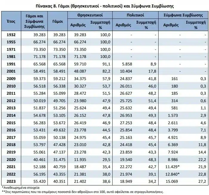 Οι γάμοι το 2023 καταγράφηκαν στους 40.351, παρουσιάζοντας μείωση 6,9% σε σχέση με το προηγούμενο έτος.