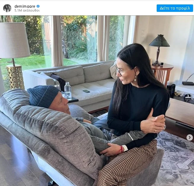 Σε μια φωτογραφία βλέπουμε την Demi Moore να συνομιλεί με τον πρώην σύζυγό της, καθώς αυτος σφίγγει τρυφερά το μπράτσο της, ενώ σε άλλο ο σταρ παίζει με την εγγονή του Louetta, το πρώτο παιδί της κόρης του Rumer. Η Demi μοιράστηκε επίσης ένα ανέκδοτο throwback στιγμιότυπο του Bruce με τις τρεις κόρες τους, τη Rumer, 35 ετών, την Tallulah, 30 ετών, και τη Scout, 32 ετών.