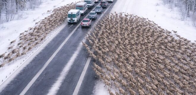 Αρχικά ακούστηκε ένας παράξενος, πολύ δυνατός ήχος. Βαθύς και παρατεταμένος, σαν κάτι να κατέρρευσε κάπου βαθιά μέσα στο δάσος. Οι οδηγοί ανησύχησαν, άρχισαν να κόβουν ταχύτητα και να κοιτάζονται μεταξύ τους. Και λίγα δευτερόλεπτα αργότερα, οι πρώτοι τάρανδοι πετάχτηκαν στον δρόμο.