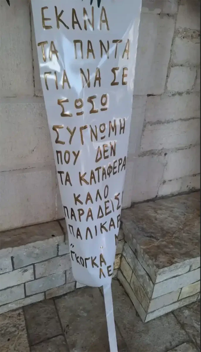 Δεκάδες ήταν και τα στεφάνια με συγκινητικά μηνύματα έξω από την εκκλησία, μεταξύ των οποίων αυτό του Γκόγκα Λεβιάν, που βούτηξε στον Άραχθο για να σώσει τα παιδιά. «Έκανα τα πάντα για να σε σώσω. Συγγνώμη που δεν τα κατάφερα παλικάρι μου», γράφει το στεφάνι του κ. Λεβιάν, σύμφωνα με το pelop.gr.