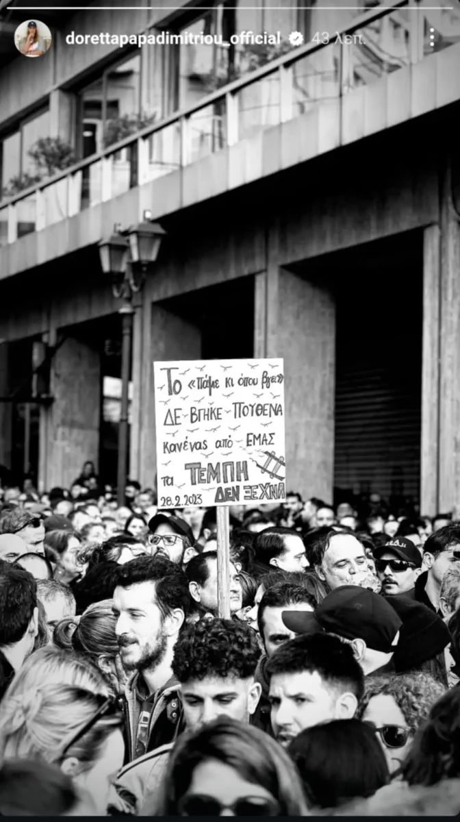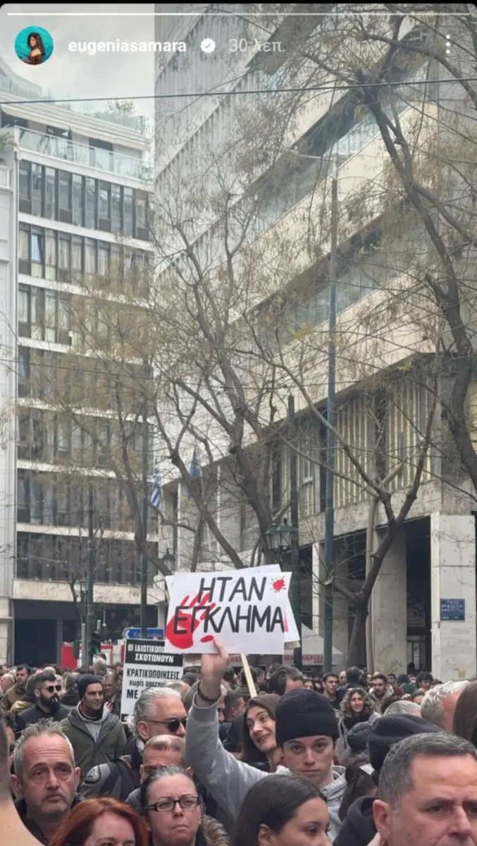 Μάλιστα, στο κέντρο της Αθήνας έδωσαν παρών και εκπρόσωποι του καλλιτεχνικού κόσμου όπως ηθοποιοί, παρουσιαστές και τραγουδιστές για να εκφράσουν την υποστήριξή τους στις οικογένειες των θυμάτων και να διεκδικήσουν δικαιοσύνη για τους 57 ανθρώπους που έχασαν τη ζωή τους.