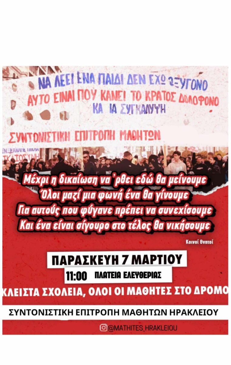 Με ανακοίνωσή της η Συντονιστική Επιτροπή Μαθητών Αθήνας καλεί στη συγκέντρωση που θα πραγματοποιηθεί την Παρασκευή, τονίζοντας ότι, «Συνεχίζουμε! Το οξυγόνο που μας στερούν, θα το βρούμε στους αγώνες μας για το δίκιο! Με εμπιστοσύνη στη δύναμη μας, στην οργάνωση, στη συλλογικότητα και στην αλληλεγγύη. Μαζί με τους φοιτητές, τους γονείς μας, τους εργαζόμενους και όλο το λαό! Για τα παιδιά που δεν έφτασαν ποτέ αλλά και για τις δικές μας ζωές, για το μέλλον που μας αξίζει!».