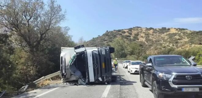 Στην προσπάθειά του να επαναφέρει το φορτηγό στην πορεία του, έστριψε αριστερά, δυστυχώς όμως το βαρύ όχημα εξετράπη της πορείας του και ανατράπηκε με αποτέλεσμα τον εγκλωβισμό του οδηγού στο εσωτερικό της καμπίνας.