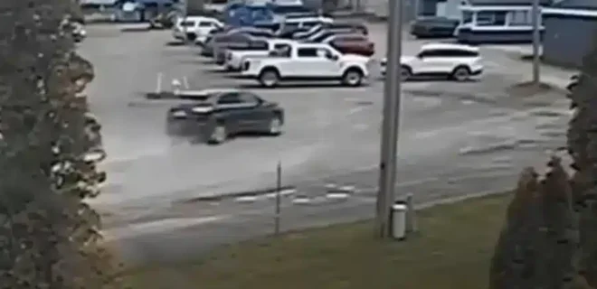 Βίντεο δείχνει το μπλε SUV της γυναίκας να περνάει με ταχύτητα μέσα από το πάρκινγκ του κλαμπ και να χτυπά τον πίσω τοίχο του κτιρίου.