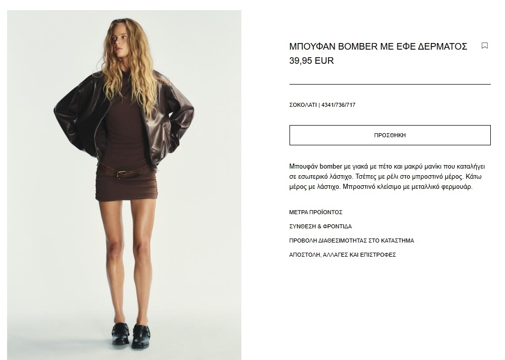 Η νέα συλλογή της Zara περιλαμβάνει πολλές παραλλαγές του bomber, από oversized γραμμές μέχρι πιο fitted επιλογές. Το κομμάτι όμως που έχει ξεχωρίσει και γίνεται κυριολεκτικά ανάρπαστο είναι το bomber με εφέ δέρματος σε σοκολατί απόχρωση – το απόλυτο φθινοπωρινό χρώμα. Με τιμή μόλις 39,95 ευρώ, προσφέρει premium εμφάνιση χωρίς να αδειάζει το πορτοφόλι σου. Είναι άνετο, ευκολοφόρετο και ταιριάζει με όλα: denim, φόρμες, υφασμάτινα παντελόνια, ακόμα και φούστες.