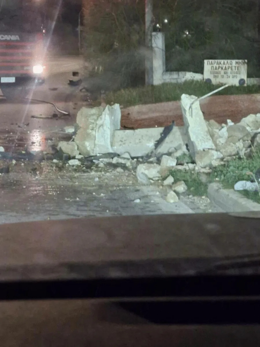 Η σύγκρουση πιθανότατα ήταν σφοδρή καθώς όπως φαίνεται και στις φωτογραφίες η μάντρα έσπασε και το όχημα αναποδογύρισε.