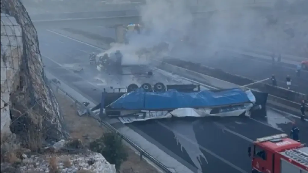 Στιγμές τρόμου έζησαν οι οδηγοί στην εθνική οδό Αθηνών Κορίνθου στα Μέγαρα στο ρεύμα προς Αθήνα καθώς μια νταλίκα ανατράπηκε και στη συνέχεια έπιασε φωτιά.
