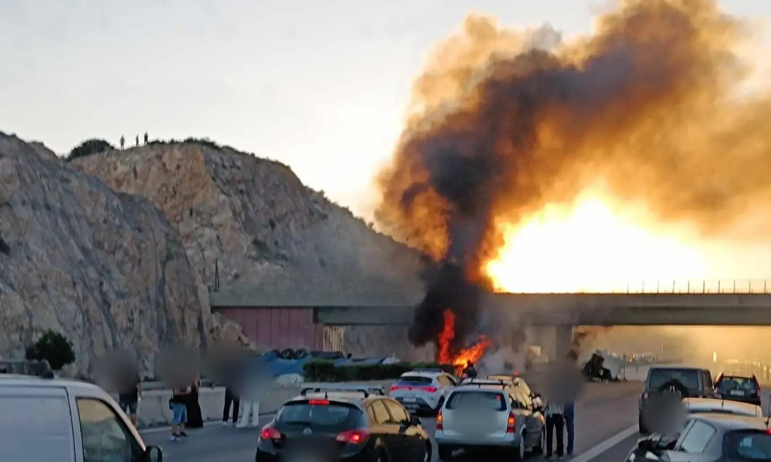 Στιγμές τρόμου έζησαν οι οδηγοί στην εθνική οδό Αθηνών Κορίνθου στα Μέγαρα στο ρεύμα προς Αθήνα καθώς μια νταλίκα ανατράπηκε και στη συνέχεια έπιασε φωτιά.