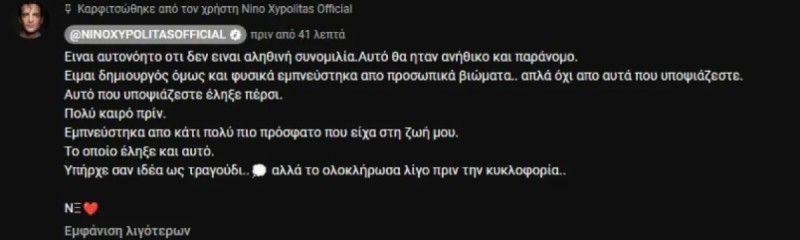 Ο Νίνο Ξυπολιτάς έδωσε τη δική του απάντηση στα ερωτήματα που προέκυψαν σχετικά με το νέο του τραγούδι «Μηνύματα» που έχει γίνει viral. Πολλοί fans αναρωτήθηκαν αν οι στίχοι του κομματιού προέρχονται από πραγματική συνομιλία, με τον καλλιτέχνη να ξεκαθαρίζει την κατάσταση μέσω σχολίου που έκανε κάτω από το κομμάτι του.