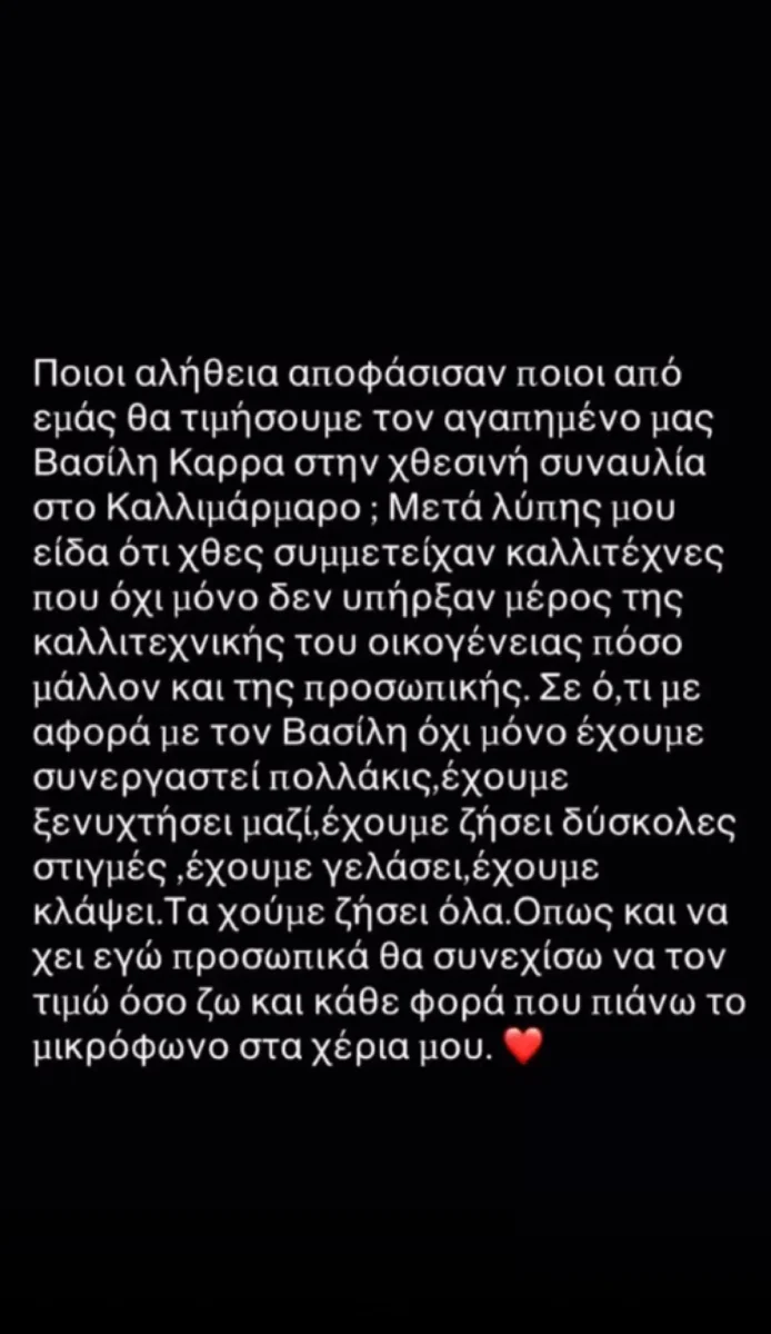 «Ποιοι αλήθεια αποφάσισαν ποιοι από εμάς θα τιμήσουμε τον αγαπημένο μας Βασίλη Καρρά στη χθεσινή συναυλία στο Καλλιμάρμαρο; Μετά λύπης μου είδα ότι συμμετείχαν καλλιτέχνες που όχι μόνο δεν υπήρξαν μέρος της καλλιτεχνικής του οικογένειας, πόσο μάλλον της προσωπικής. Σε ό,τι αφορά εμένα, με τον Βασίλη όχι μόνο έχουμε συνεργαστεί, έχουμε ξενυχτήσει, έχουμε ζήσει δύσκολες στιγμές,έχουμε γελάσει, έχουμε κλάψει. Τα χουμε ζήσει όλα. Όπως και να ‘χει, εγώ θα τον τιμώ όσο ζω, κάθε φορά που πιάνω το μικρόφωνο στα χέρια μου», έγραψε η Αγγελική Ηλιάδη.