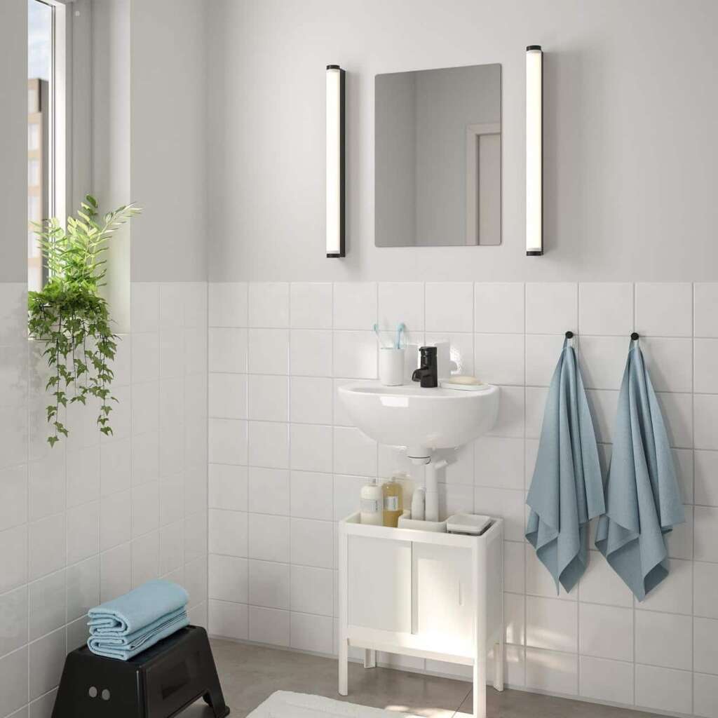 Το συγκεκριμένο μοντέλο που βρήκαμε στα καταστήματα ΙΚΕΑ είναι λευκό και είναι ιδανικό για μικρότερα μπάνια, καθώς το κύριο ντουλάπι έχει πλάτος μόλις 44 εκ. Προσφέρει αρκετό χώρο για ράφια, καθώς και χώρο για σωληνώσεις στο πίσω μέρος του ντουλαπιού. Είναι το κατάλληλο σημείο για να αποθηκεύσετε το χαρτί τουαλέτας ή τα υγειονομικά προϊόντα που συνήθως καταλαμβάνουν χώρο.