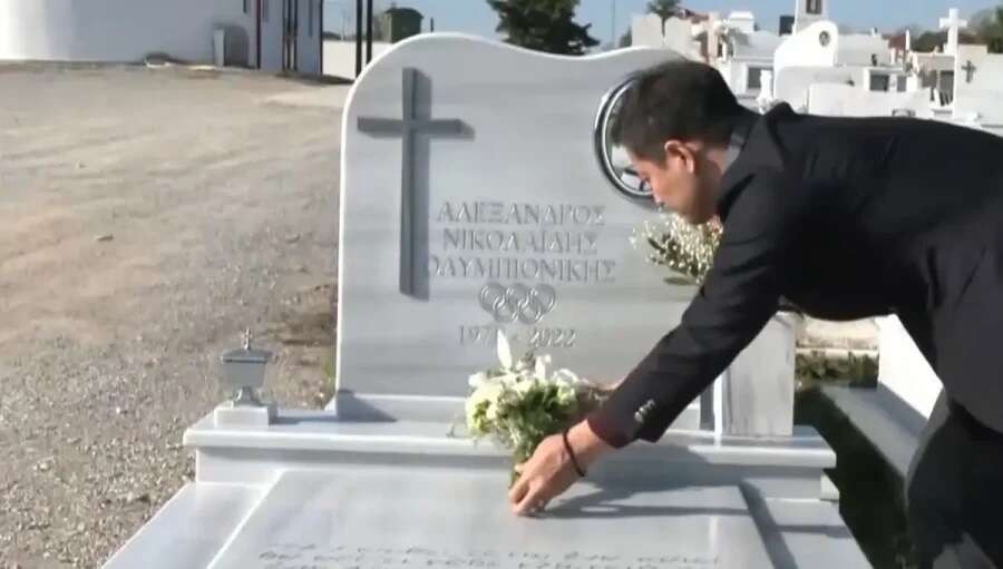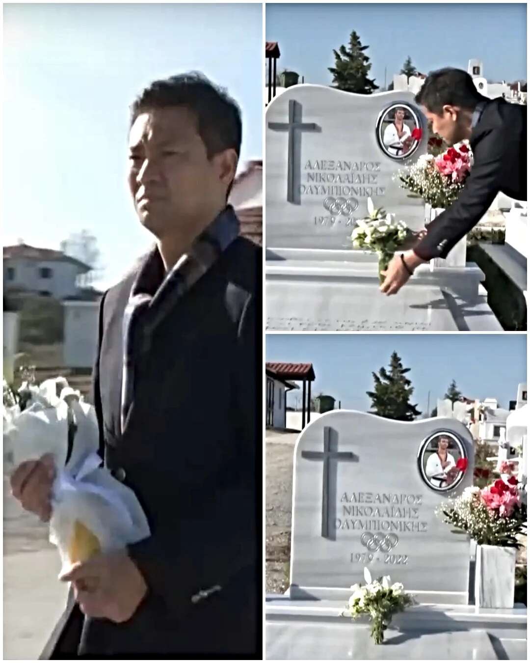 Τελικά, κατάφερε να φτάσει στο κοιμητήριο του Φιλύρου, όπου βρίσκεται ο Έλληνας Ολυμπιονίκης, και άφησε συγκινημένος μερικά λουλούδια.